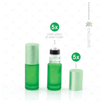 Deluxe Frosted 5ml Green Roller Bottles with Green Metallic Caps & Premium Rollers (5 pack) Deluxe Frosted 5ml Green Roller Bottles with Green Metallic Caps & Premium Rollers (5 pack)