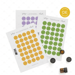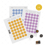 Contents: 700 total stickers (20 sheets of 35 stickers) + Folder Tabs (Single Oils, Oil Blends, Sample Tracker (7 double sided pages),Sampling Supplies (3 double sided pages))- GERMAN