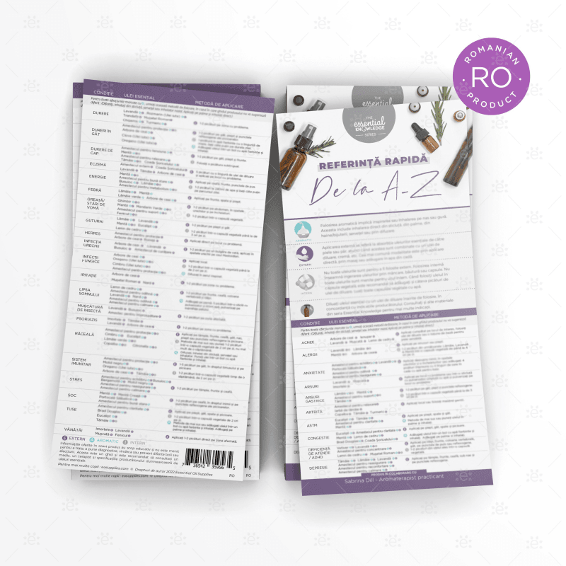 You've come to love the Essential Knowledge Series Materials and now by demand we've created these delightfully designed quick reference A-Z cards as an introduction to how to use essential oils for 50 common ailments - in ROMANIAN