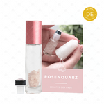 Contents: 1 x Rose Quartz gemstone rollerball, 10ml clear roller bottle approximately 1/3 full of Rose Quartz gemstone chips, co-ordinated aluminium cap & instructional card - GERMAN