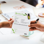 Takes only seconds to fill out and allows you to provide your contacts with clear instructions on what area of the body the sample will support, in addition to your detail on how to make the best use of their sample. On the bottom is a convenient tear-off section that allows you to capture your contacts' details. The reverse of the tear pad contains key essential oil usage and safety instructions and a place for providing your contact information too - an ideal accompaniment to your business tools kit.