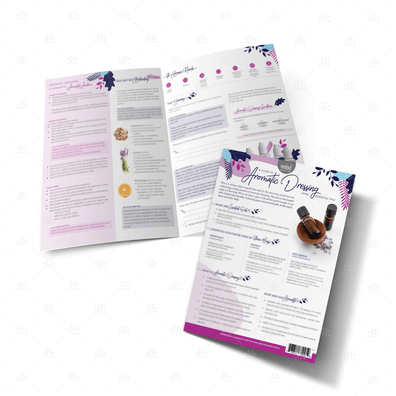 Created with Vanessa Jean Boscarello Ovens, Aromatic Dressing 4-page educational brochure, part of the Essential Knowledge Series, is the ideal material to teach a class about self love by highlighting the benefits of using essential oils and encouraging a daily practice of aromatic dressing that makes your skin look and feel healthy.