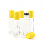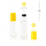 Contents: 5 x 10ml clear bottles with yellow cap and new style stainless steel rollerballs