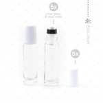 Contents: 5 x 10ml clear bottles with EOS signature snow white cap and new style stainless steel rollerballs