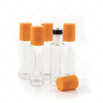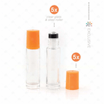 Contents: 5 x 10ml clear bottles with tangerine (orange) cap and new style stainless steel rollerballs