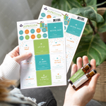 This label design has been created uniquely as a multi-use label that you can simply use as full size on a roller or spray bottle, or on alternative sized bottles of your choice as you personalise and customise to your requirements. May be you wish to make a half sized bottle as a sample or up-cycle your old 5 & 15ml essential oil bottle by topping with a roller top or fine misting spray top. With our multi-use labels you can trim according to the guides provided on the label sheet and use them to fit a variety of bottles - see the graphic for illustration.