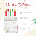 This set has the materials and recipes to make five very special Christmas Roller Bottle blends that you can present in the beautifully co-ordinated Christmas-themed boxes, each with their own cheerful and joyous looking labels to adorn the Deluxe Frosted roller bottles and metallic caps.