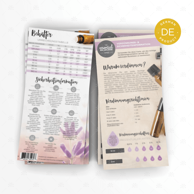 Part of the "Essential Knowledge Series", this rack card, now available in GERMAN, is an ideal quick reference guide containing nationally recognised guidelines for using essential oils. It contains a brief overview as to why dilution is important, conversion ratios for varying age ranges, capturing dilution guidelines, safety information and a conversion table to enable you to quickly see how to convert drams, drop, ml, oz, tbsp and tsp.