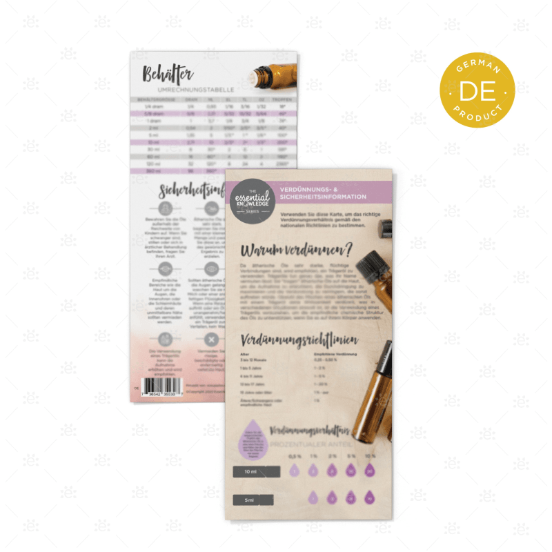 Part of the "Essential Knowledge Series", this rack card is an ideal quick reference guide containing nationally recognised guidelines for using essential oils. It contains a brief overview as to why dilution is important, conversion ratios for varying age ranges, capturing dilution guidelines, safety information, and a conversion table to enable you to quickly see how to convert drams, drop, ml, oz, tbsp, and tsp - GERMAN.