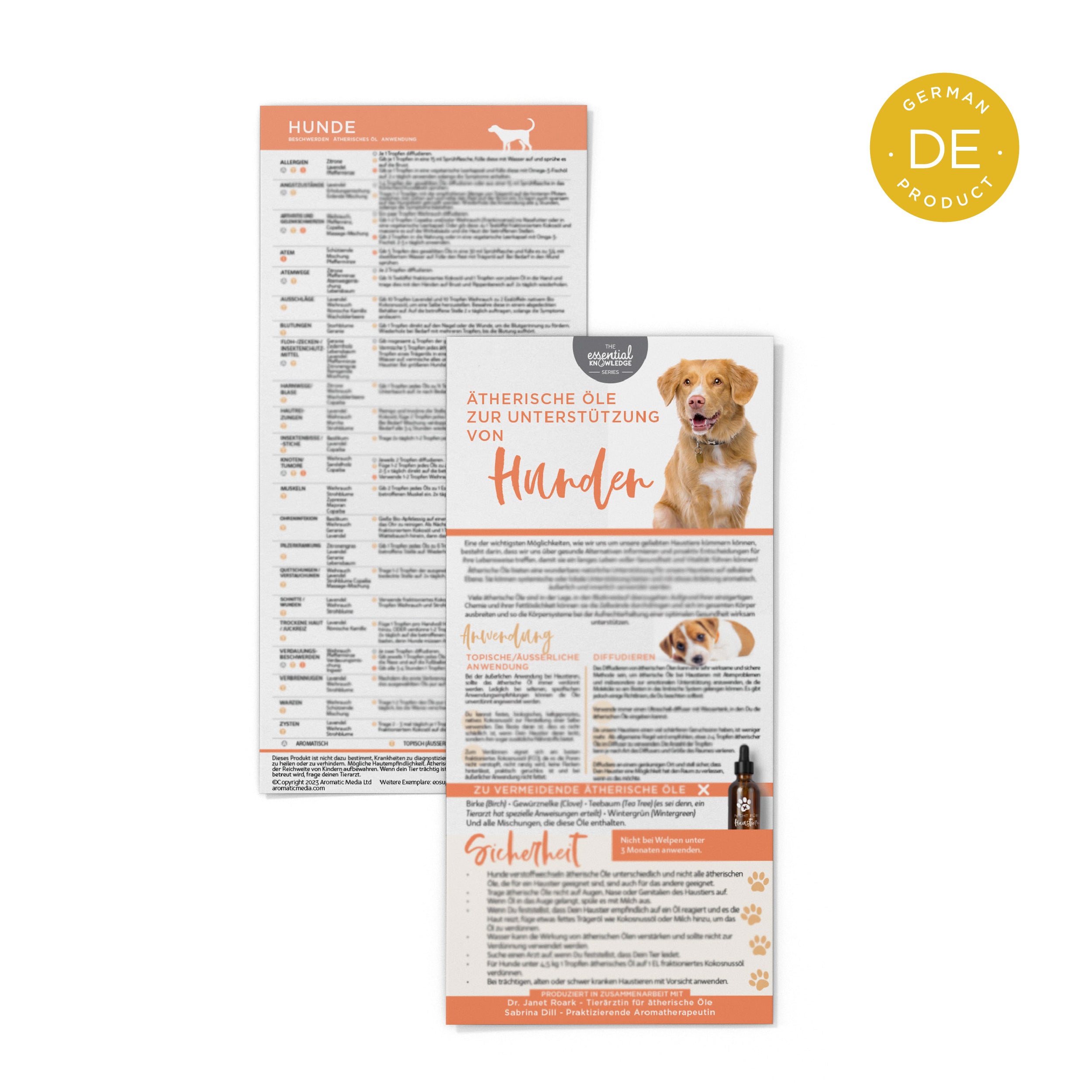 The front of this card details usage guidance for topical use and diffusing as well as safety, while the back of the card has details on how to use your essential oils for different ailments that may affect your dog.