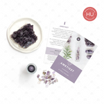 Along with the Amethyst gemstone rollerball, this set also comes with a 10ml clear roller bottle adorned with a premium aluminium co-ordinated cap, which is approximately 1/3 full of Amethyst gemstone chips. This set is accompanied by an individual instructional card detailing the wellness and emotionally supportive areas that this gemstone can support with suggested essential oils to compliment its use.