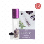 Contents: 1 x Amethyst gemstone rollerball, 10ml clear roller bottle approximately 1/3 full of Amethyst gemstone chips, co-ordinated aluminium cap & instructional card - HUNGARIAN