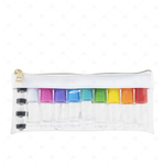 Contents: 9 x Clear Glass Roller Bottles with Premium Stainless Rollers and Signature Multi-coloured Plastic Caps and Clear Zipper Pouch