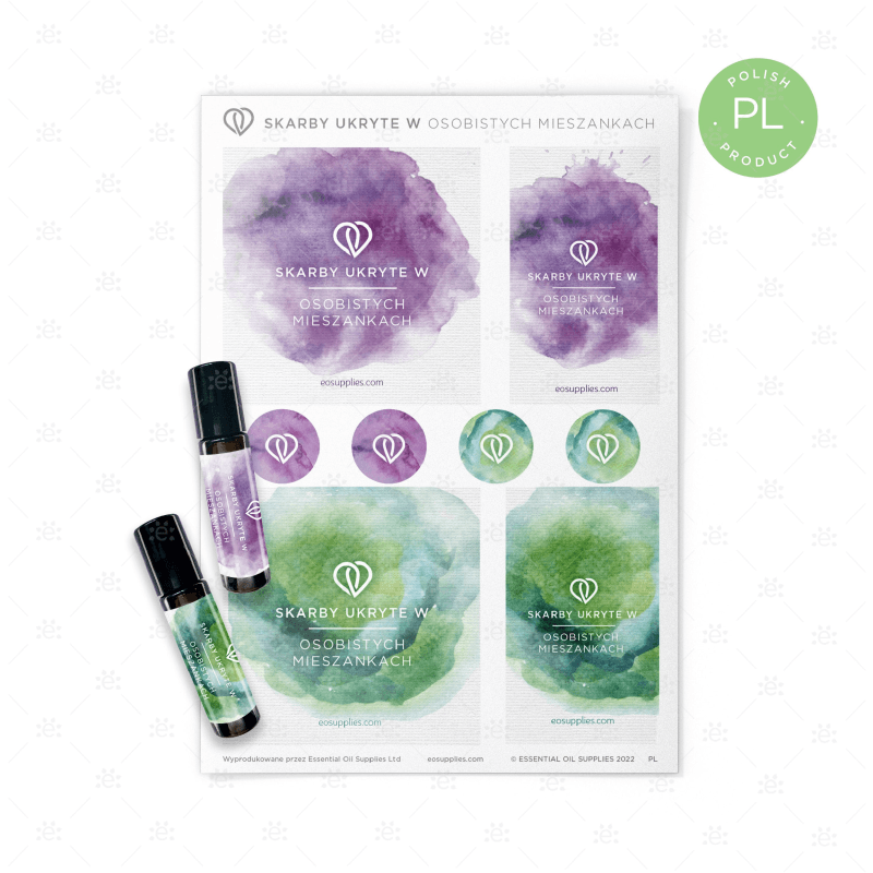 Contents: 4 roller bottle labels (2 x 10ml and 2 x 5ml) with 4 cap stickers - Polish